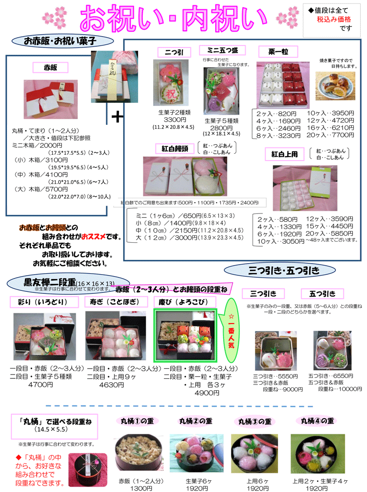 紅白まんじゅう・紅白餅(※) お祝い事に欠かせない紅白まんじゅう・紅白餅。 上棟祝い・入学祝い・快気祝いなどにどうぞ。 小・中・大とサイズをご用意しております。 おまんじゅうは、紅はつぶ餡、白はこし餡でご用意させて頂いております。 |